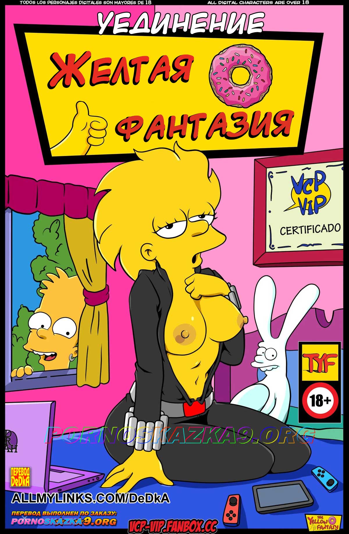 Порно комикс «Симпсоны. Часть 62. Мама моей девушки.» Барт нашел себе новую подружку, но она оказалась не из простых! Дженнифер разрешила ему только совместную мастурбацию, но, кончив, уснула, оставив своего парня без внимания. Разозлившись, Барт ушел со стояком и по дороге столкнулся с мамой Дженнифер…